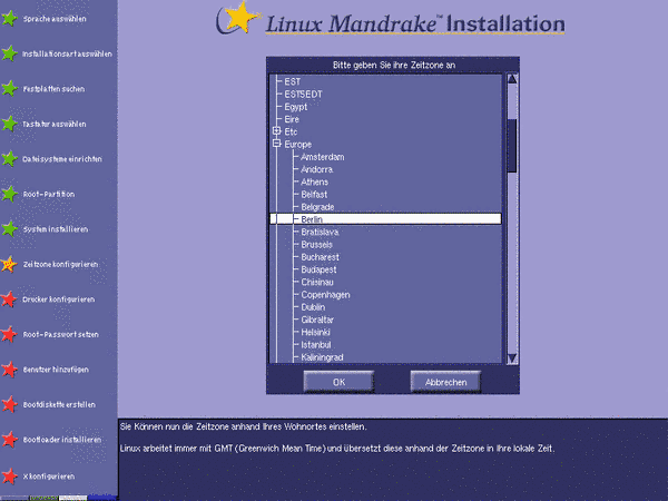 DrakX versucht, Ihre Zeitzone anhand der ausgewählten Sprache zu erraten. Aber ebenso wie bei der Auswahl der Tastatur kann es sein, dass dieser Versuch fehl schlägt. Sie können dann diesen Schritt wählen, um die Uhr anhand Ihrer Zeitzone zu konfigurieren (Abbildung 7-7).