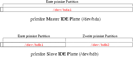 Die Geräte am ersten IDE-Controller (seien es Festplatten, CD-ROM-Laufwerke oder was auch immer) erhalten immer die Namen /dev/hda (für das Masterlaufwerk) und /dev/hdb (für das Slavelaufwerk).