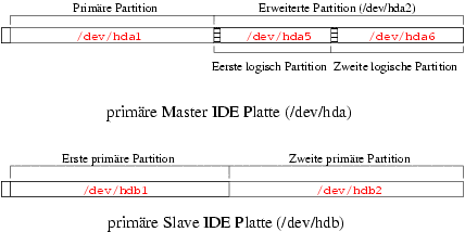 Die Logischen Partitionen, sofern vorhanden, erhalten die Bezeichnungen /dev/hda5, /dev/hda6 usw. in Reihenfolge der Partitionstabelle der Erweiterten Partition.