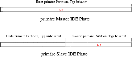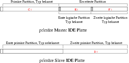 Die folgenden Abbildungen zeigen einen Rechner mit zwei IDE-Laufwerken am selben Controller, jeweils verschieden partitioniert: