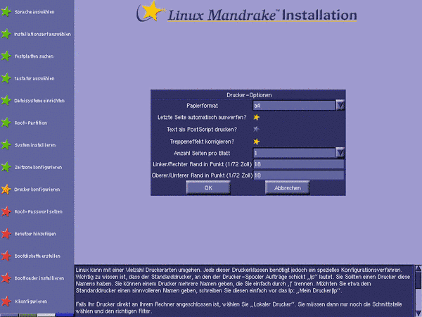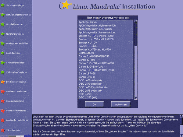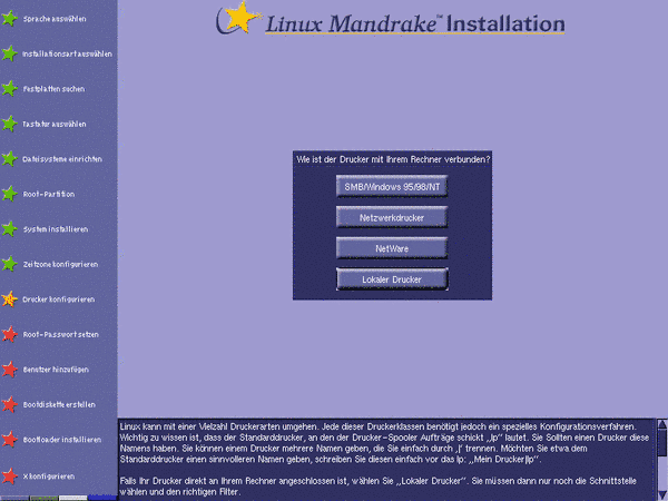 Wenn Sie unter Linux drucken möchten, müssen Sie zwei Dinge konfigurieren: zum einen die Zugriffsart (Lokal oder Netzwerk) und zum anderen den Druckerfilter, der die von Linux verwendete ,,Sprache`` in die Ihres Druckermodells umwandelt.