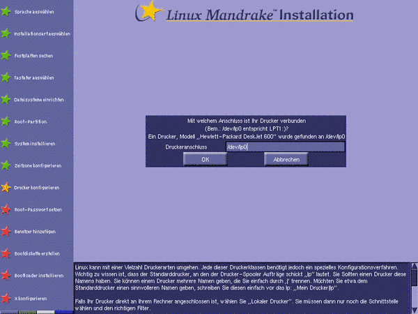 Lokale Drucker neueren Herstellungsdatums wird DrakX in den meisten Fällen automatisch erkennen. Sollte dies fehlschlagen, wird Sie DrakX nach dem Anschluss fragen, mit dem Ihr Drucker verbunden ist. Besitzen Sie nur einen lokalen Drucker, lautet die Antwort immer /dev/lp0 (Abbildung 7-10).