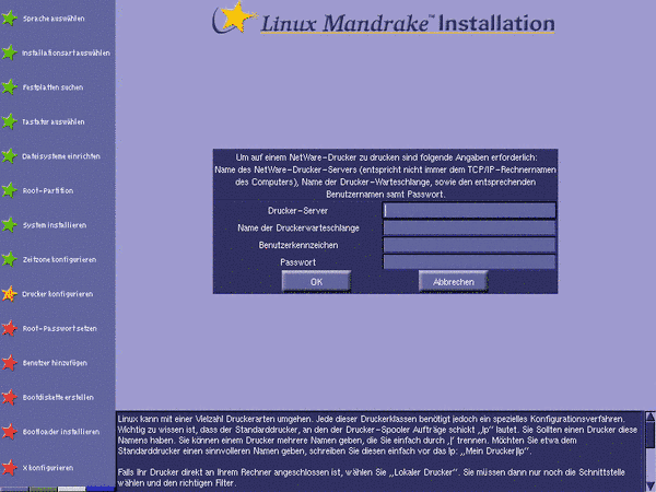 Für Netware-Drucker gelten nahezu dieselben Optionen. Auch hier stellt der Servername ein Problem dar: das verwendete Netzwerkprotokoll (IPX) verwendet ebenfalls ein eigenes Schema. Fragen Sie Ihren Netzwerkadministrator nach dem IPX-Namen des Servers. Des Weiteren müssen Sie Ihren Benutzernamen und Ihr Passwort eingeben (Abbildung 7-13).