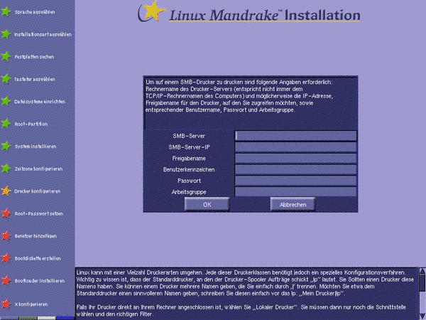 Bei der Konfiguration eines SMB-Druckers (also eines Druckers an einem Windows-Server), müssen Sie besonders darauf achten, dass der Name des Servers, den Sie angeben müssen, nicht der DNS-Name der Maschine ist! SMB benennt die Maschinen eines Netzwerks nach einem eigenen Muster und Linux verwendet dieses Protokoll, um die Drucker anzusteuern. Am besten ist es, Sie fragen Ihren Netzwerkadministrator nach dem SMB-Namen des Servers. Sie können aber auch die IP-Adresse des Servers angeben. Schließlich braucht DrakX noch Ihren Benutzernamen, Ihr Passwort und den Namen der Arbeitsgruppe unter denen Sie Zugriff auf diesen Drucker haben (Abbildung 7-12).
