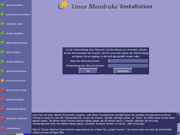 Haben Sie Zugriff auf einen Unix-Netzwerkdrucker, müssen Sie den Namen des Rechners angeben, welcher den Drucker verwaltet, sowie den Namen der Drucker-Warteschlange auf dem entfernten Rechner (diese kann anders lauten als auf Ihrem Rechner); (Abbildung 7-11).