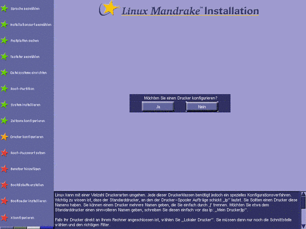 DrakX versucht einen Drucker an Ihrem Parallelport zu finden. Moderne Drucker authentifizieren sich selbst, so dass sie keine Probleme darstellen sollten. Kann DrakX keinen Drucker finden, überspringt es diesen Schritt. Sollten Sie dennoch einen Drucker einrichten wollen, müssen Sie diesen Schritt explizit anwählen. Sie müssen dann die Frage, ob Sie einen Drucker einrichten wollen mit Ja beantworten (Abbildung 7-8).