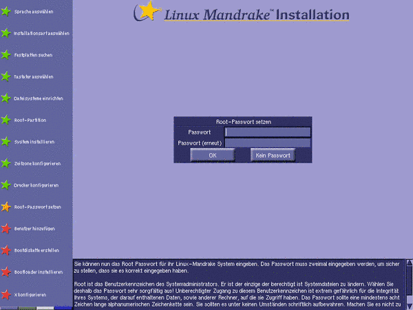 Das Passwort sollte eine mindestens acht Zeichen lange alphanumerischen Zeichenkette sein. Sie sollten es unter keinen Umständen schriftlich aufbewahren. Machen Sie es nicht zu lang oder zu kompliziert, schließlich sollten Sie sich ohne größere Anstrengungen daran erinnern können. DrakX wird Ihnen mitteilen, ob Ihr Passwort den gängigen Sicherheitsvorstellungen entspricht. Sie müssen zwar kein Passwort vergeben, doch wir raten Ihnen dringend, dies zu tun!